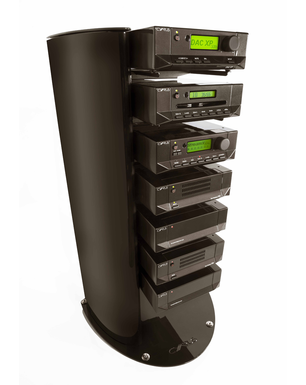 The Anniversary Series System comprises carefully upgraded versions of the following range-topping X Series components: the CD XT SE₂ CD transport; Stream X₂ network music player; DAC XP+ (DAC with preamp); 2x Mono X 300 power amps and 2x PSX-R power supplies. Sold as a complete package, the Anniversary System comes bundled with interconnect cabling, a Hark II - Storage Rack with 7 shelves, n-remote system remote control and a Cyrus Cadence iPad app.