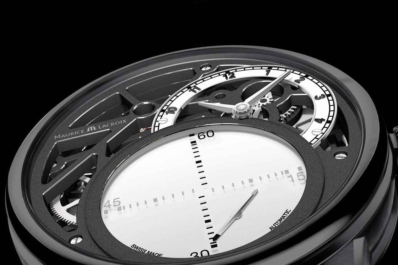 Numerous elements testify to Maurice Lacroix's supreme know-how, whether it be the impressive seconds indication and the skeletonization, or the off-centered hours that are one of the brand's trademark features. Yet the perplexing seconds indicator remains the most captivating of mysteries. Driven by the ML215 caliber – a new Maurice Lacroix Manufacture movement and the twelfth to be entirely developed in-house – the mysterious hand marks out a linear reading of the seconds, in alternating horizontal anf vertica 15-second cycles. The blued hand turning on its axis, as though in full levitation, produces the captivating optical illusion.