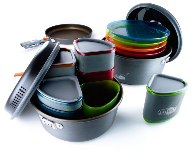 ● Four insulated mugs and four bowls with four plates make a complete four person cook set