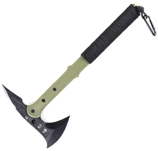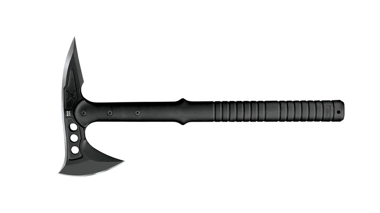 Created by United Cutlery this M48 Hawk is the ultimate tactical weapon. It is lightweight to be carried all day without added muscle fatigue and the blade of the M48 Hawk offers a wide, upswept axe blade for mammoth chopping, slashing and cutting potential. The secondary edge on the back side of the head is specially sharpened on both edges for a cutting and hooking attack. When combined, the spike and axe head make for an efficient personal defense and breaching tool. The blade is securely attached to the indestructible 30-percent nylon reinforced handle with three separate bolts. It comes complete with a nylon snap button sheath.