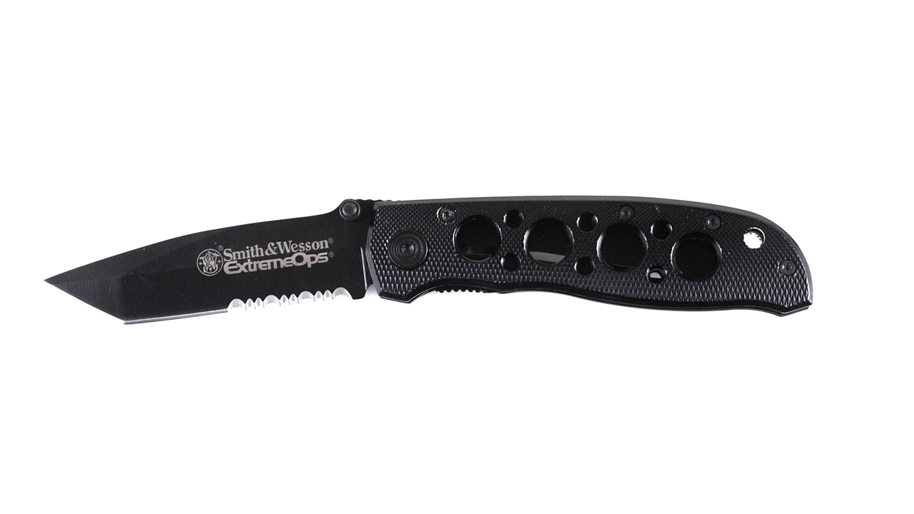 The Smith & Wesson CK5TBS Extreme Ops serrated knife is ideal for camping, hunting, fishing, and a host of other applications. The folding knife offers a comfortable black aircraft aluminum handle that measures 4.06 inches long, along with a 3.22-inch partially serrated stainless tanto blade that cuts through everything from vegetables to fishing line. The blade also secures tightly via the liner lock, but opens quickly with either hand thanks to the thumb rest and dual thumb studs. Other features include a stainless pocket clip and a lanyard hole. The knife weighs 2.8 ounces and carries a limited lifetime warranty.