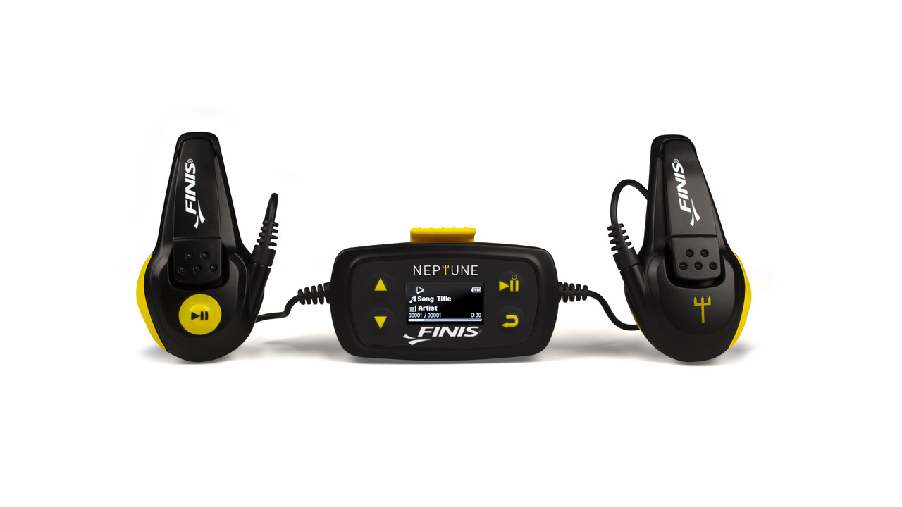 Neptune is a waterproof MP3 player that provides the highest quality sound in the water without the use of ear buds. Neptune uses revolutionary Bone Conduction audio transmission to transmit crystal clear audio through the cheekbone directly into the inner ear. With 4GB of storage, aquatic athletes can listen to music, audio books, podcasts and more, all with incredible sound. The included charging cable also allows for quick song upload to the device. The 3-piece design has 2 side speakers and a high contrast OLED screen that sits comfortably on the back of the head. The screen shows the song, artist and play status for each use. Neptune attaches securely to goggle straps and rests on the cheekbones as to not interfere with swimming technique.