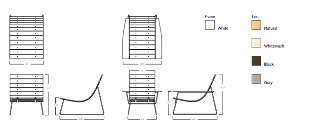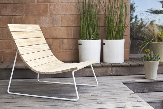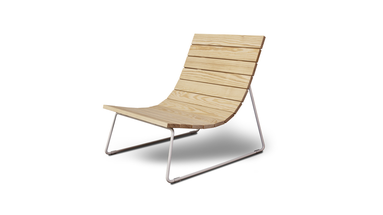 The Plank Collection was designed for relaxed outdoor living. All pieces are structured around a frame of white powdercoated steel with weather-treated pine slats in a natural, whitewashed, black-stained or gray-stained finish. The Plank Lounger recalls a traditional Adirondack chair with its deep, low-slung seat, but cuts a decidedly more modern profile. Horizontal wood slats finished with softly-rounded edges attach to a lithe metal frame. The Lounger is available with or without arms.
