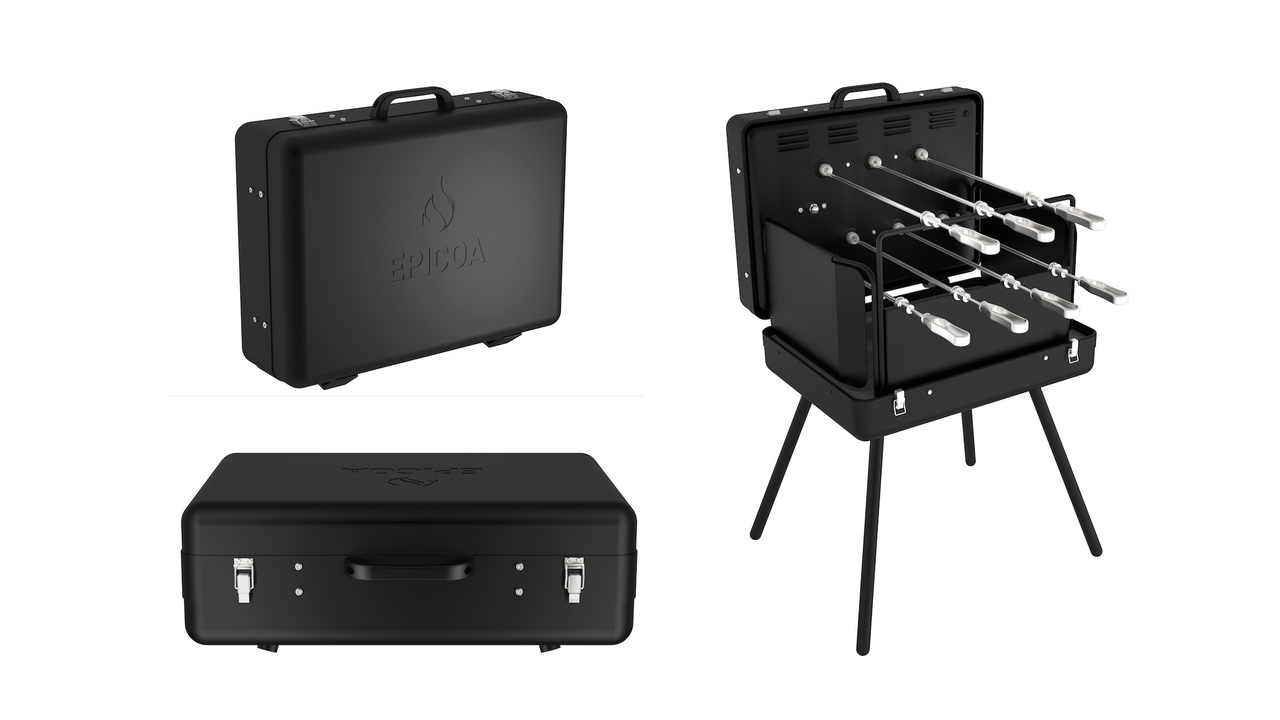 Where you can grill is only limited by where you can go. The Epicoa Rotisserie Grill breaks down into the base of the grill and closes up into a convenient, portable briefcase. Each Epicoa Rotisserie Grill includes a rechargeable 12V battery that provides 6-8 hours of cooking, power cord, and A/C adapter, all of which conveniently store inside the grill.