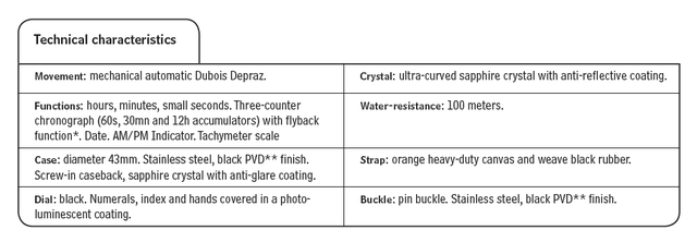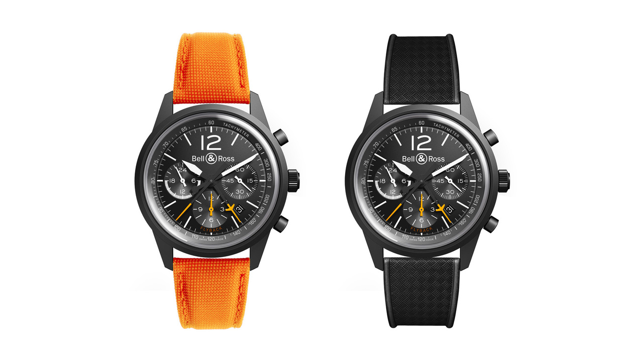 Since legibility of on-board instruments is vital in aeronautics, two colors are prevalent in cockpits: matte black for its anti-reflective properties and white for its extreme legibility. Orange –reserved for essential information also has an important presence and, having always featured on the dials of the Bell & Ross Vintage collection, has become emblematic of the brand. In order to promote the most important information, a touch of orange makes all the indications linked to the chronograph function stand out in contrast against the matte black. To further enhance the watch’s legibility, the chronograph’s central minute and second functions are displayed across the full width
