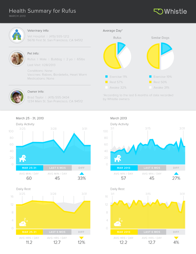 Whistle uses information including weight, age, breed, and location to provide rich, individualized insights about your pet. Whistle highlights the details that matter, so a quick glance gives you a sense of how they’re doing.
