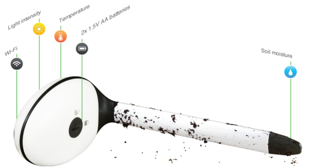 The Wi-Fi Plant Sensor measures soil moisture, light intensity and temperature. Using the built-in Wi-Fi module, the data is sent to the Koubachi cloud, where it is analyzed by the Koubachi Plant Care Engine based on scientific plant care models developed in cooperation with biologists. The plant owner is provided with detailed care instructions regarding watering, fertilizing, misting, temperature and light through push notifications or email.