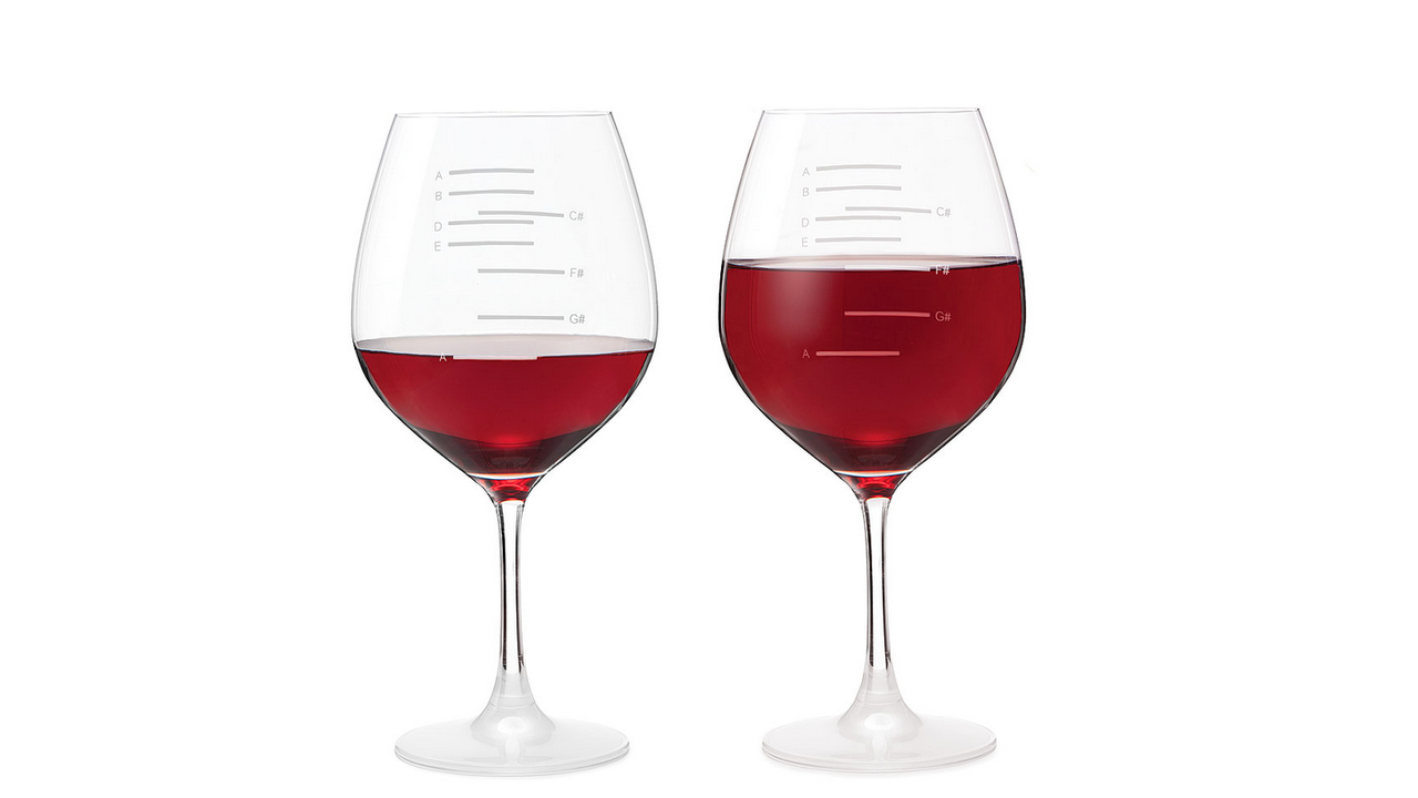 Create a sweet symphony on your tabletop or delight your favorite music-loving wine enthusiast with this songful set of musical wine glasses. Featuring a large goblet the size of a classic red wine glass, this innovative glass is big enough to accommodate a full A-major scale, along with your favorite wine or non-alcoholic beverage. Musical notes are labeled with sandblasted fill lines, so just pour to the desired note and run your moistened finger along the rim.