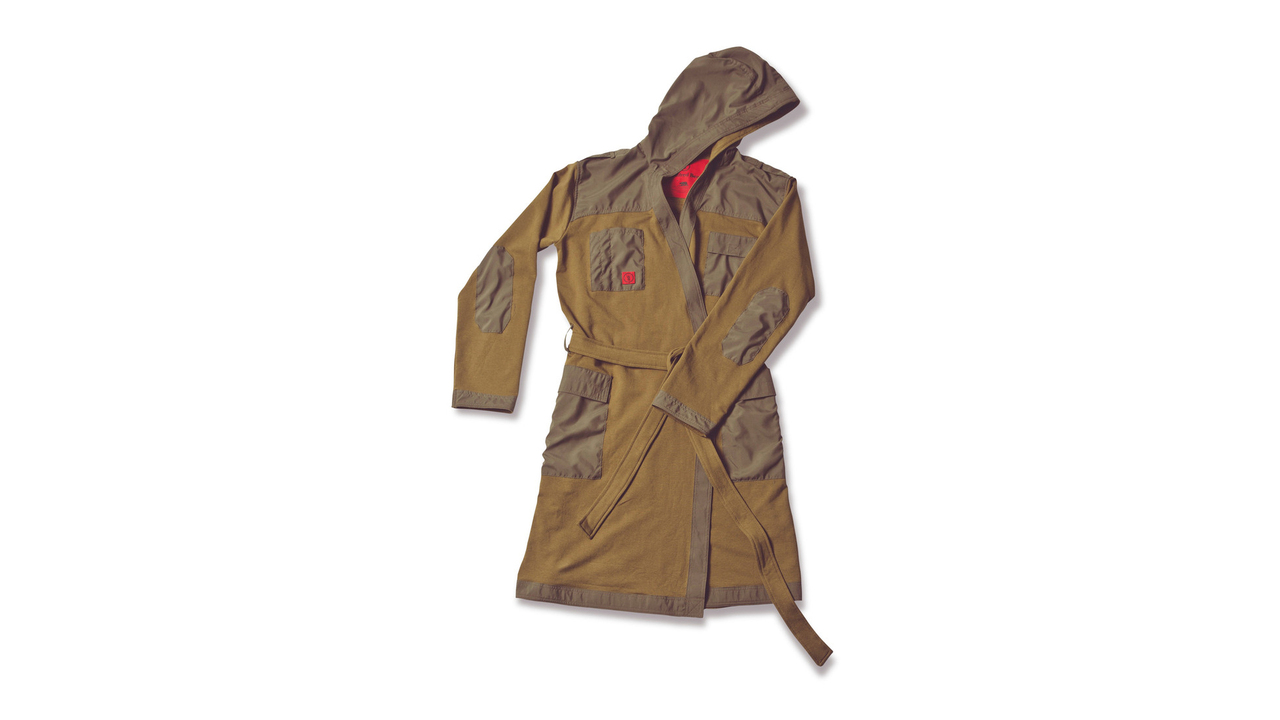 The Winnifred Beach (sport-utility) Bathrobe combines the function of technical outerwear with the simple comfort of a bathrobe. Designed for use both in and out of home and made from organic bamboo-cotton fleece with brushed nylon panels and pockets.