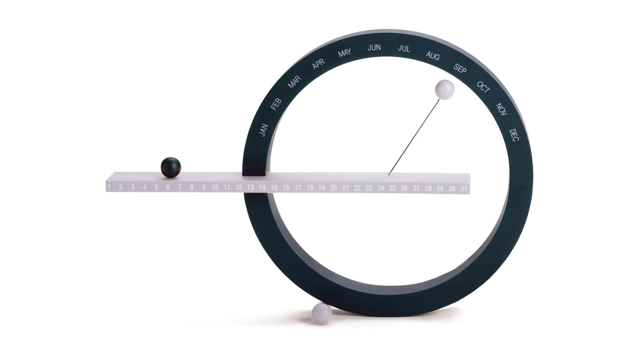 Designed for the Museum of Modern Art, NY, this unique calendar can be used year after year thus making it an eco-conscious product. The calendar can be placed on a desktop or mounted on a wall. Its string-tethered Maglev (magnetic levitation) ball is suspended in mid-air and is manually moved to mark each month. A second ball on the horizontal beam indicates the day. Constructed of injected-molded ABS recyclable polymer and magnets.