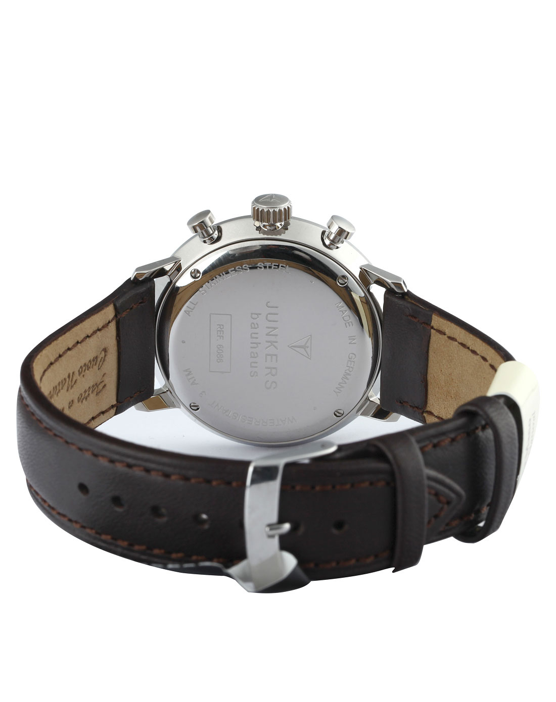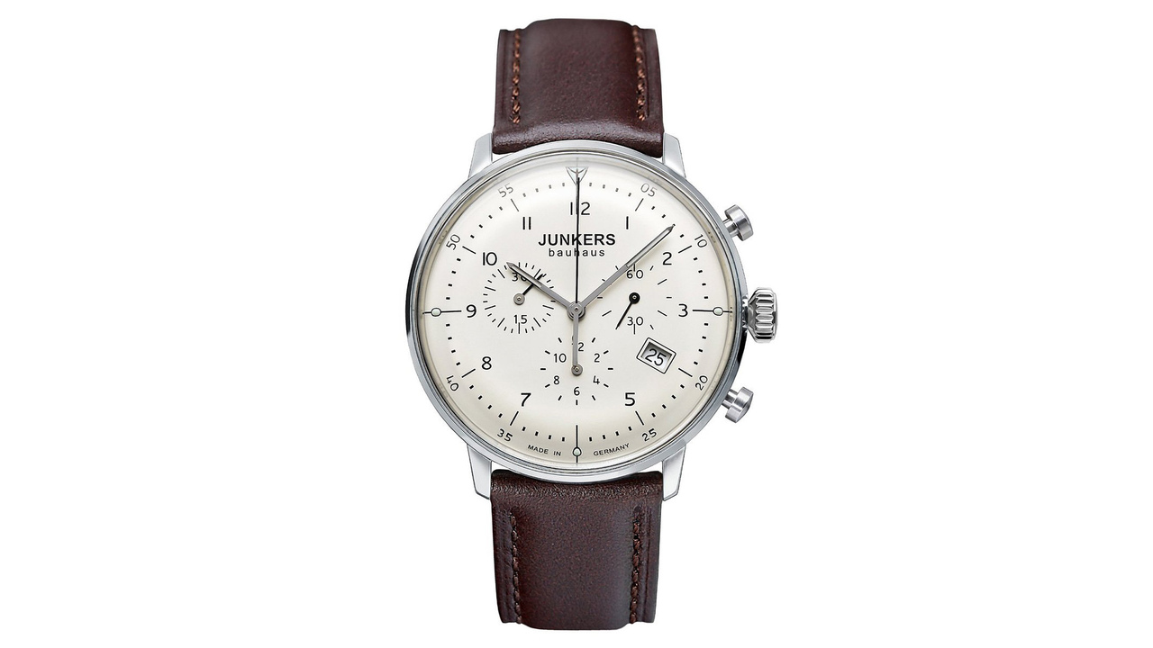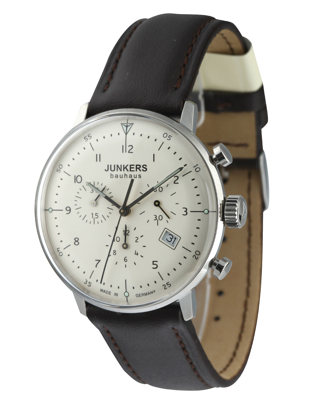 The Junkers Bauhaus quartz chronograph watch (ref 6086-5) features an elegant design that is perfect for casual or dress occasions. The light beige dial features thin Bauhaus-styled hour markers, luminous dots at 3, 6, 9, and 12, and sub-dials for seconds, 30-minute timer, and a 12-hour totalizer. The silver hour and minute hands are luminous filled and a date window is shown at 4:00.