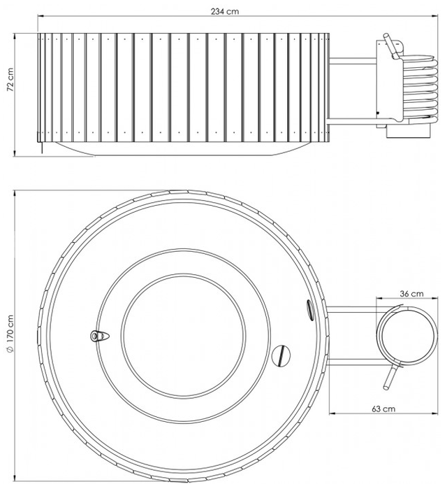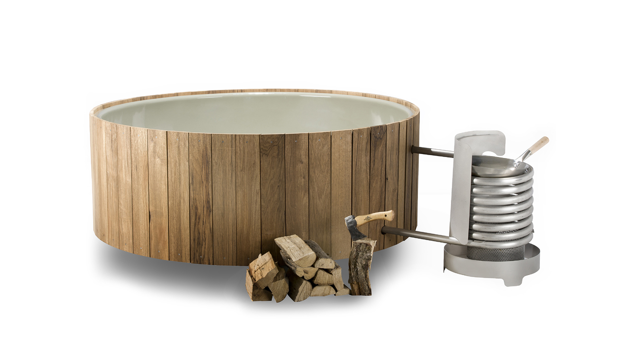 The Dutchtub Wood is a wood fired outdoor hot tub: a fire in the coil warms the water in the tub. Natural circulation causes the colder water at the bottom of the Dutchtub to go in the spiral, heat up and flow out at the top.