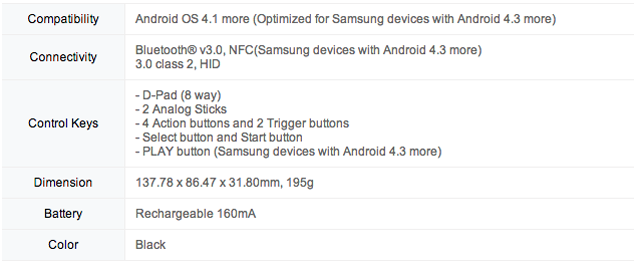 GamePad easily connects with smartphones and tablets through Bluetooth pairing. The most convenient features optimized for Samsung Galaxy devices running Android 4.3 such as Galaxy Note 3, S4, Note II, and S III enable easy connectivity with GamePad via NFC tag and quicker access to games via the “PLAY” button.