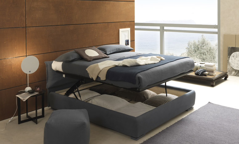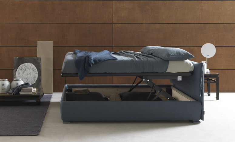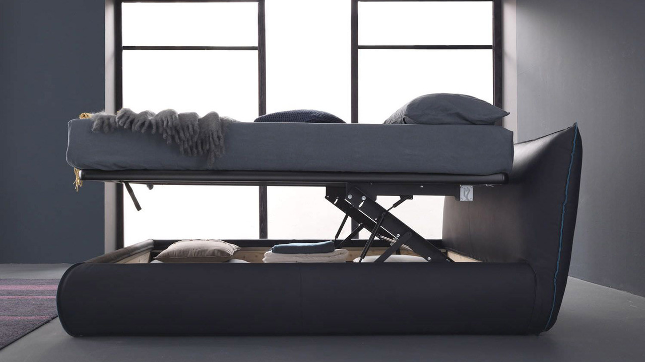 The Bolzan Letti Iorca bed features a backrest that takes the shape of two soft pillows and mechanical arms that lift up the mattress to reveal a hidden storage compartment below.