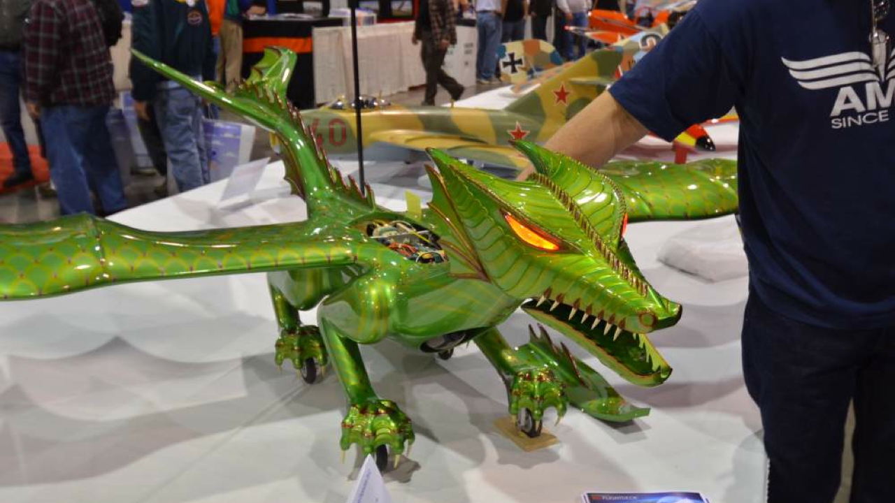 A miniature turbine engine built into the beast’s chest provides thrust that exits the rear at 500 mph, and uses 1/2 gallon of jet aircraft fuel or kerosene for 10 minute flights. With a head that swivels in the direction of turns, the dragon can climb and dive via wing ailerons and elevators built into its V-tail rudder, controlled with the 2.4GHz radio remote.