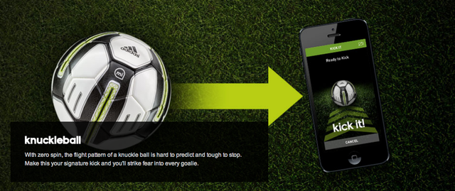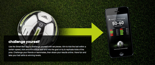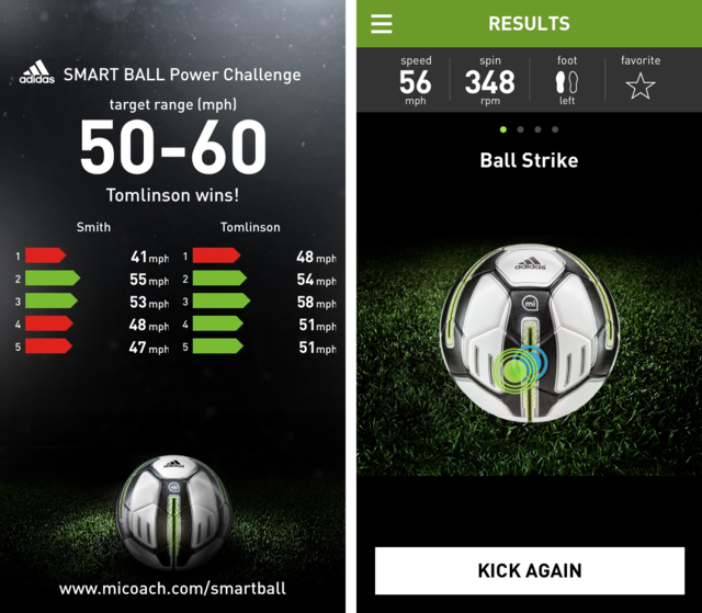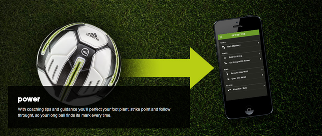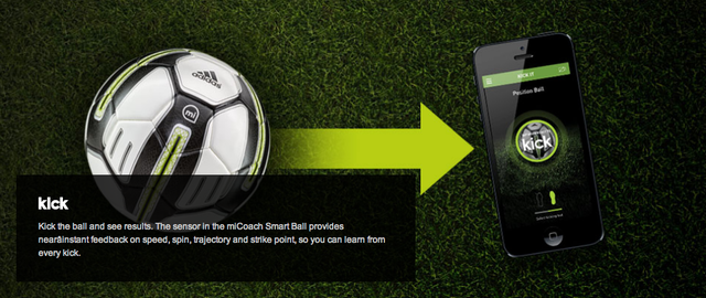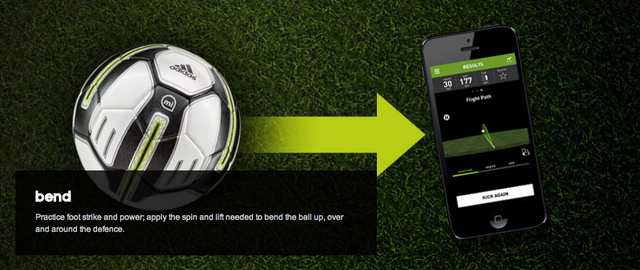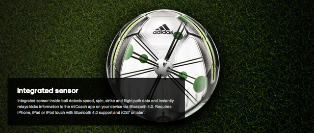 The Adidas miCoach Smart Ball is a Bluetooth Smart and app-enabled soccer ball with integrated sensor technology for dead-ball kicking training such as penalties, free-kicks, shooting, corners, long passes or goal kicks. The Smart Ball relays data on how hard it has been struck, offers visual flight trajectories, depicts ball spin and shows impact points via the adidas miCoach Smart Ball app available for iPhone and iPod touch. This data can then be used to help train players, providing coaching instructions on how to alter kicking technique to bend free kicks, launch knuckle balls and generate more shot power.