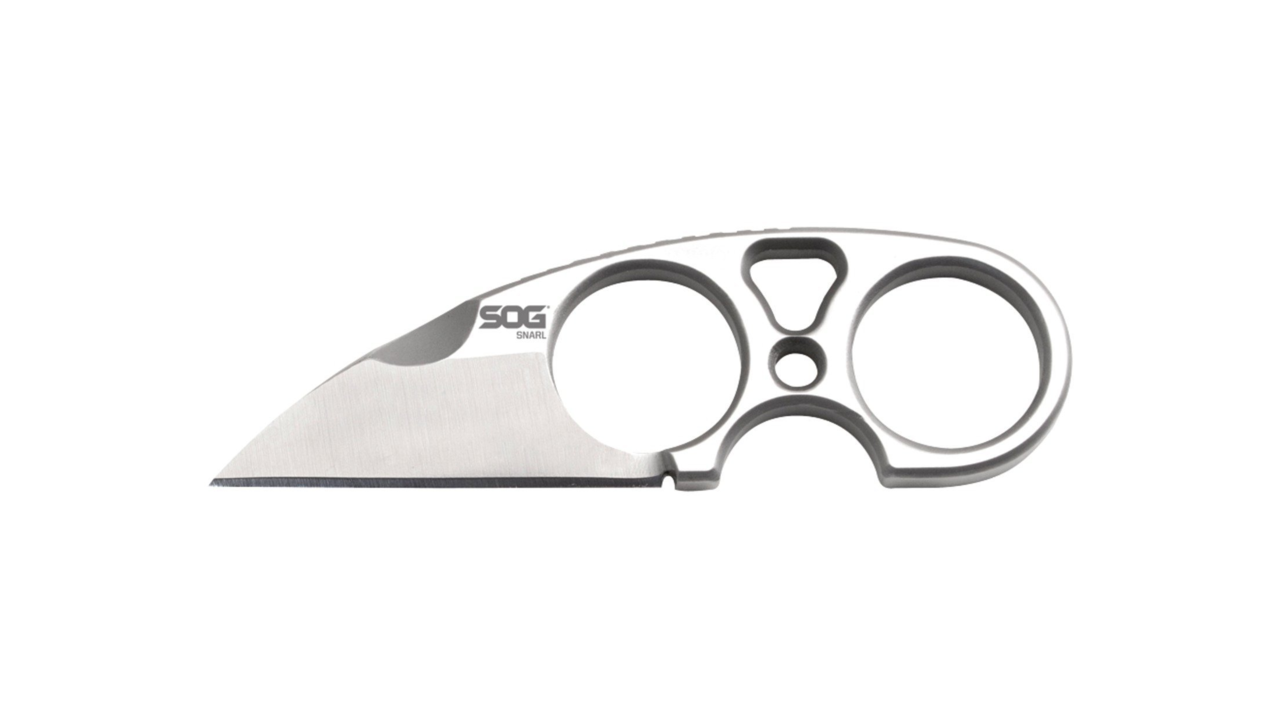 Jason Brous designed a "functional fantasy" Snarl knife that features a 9CR18MoV stainless steal blade. It's like a brass knuckles/SOG mash-up.