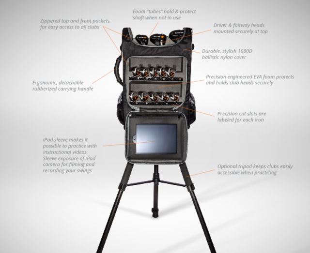 The secret to golf without obstacles is DV8's patented coupler technology, which allows club heads to be interchanged on one or two custom shafts. The set is carried in a stylish, super durable backpack with club head changes taking less than 3 seconds with no tools or torque wrenches required. The entire system is roughly one-third the weight and one quarter the size of a traditional set. The DV8 bag also features a tablet compartment enabling users to film their swing or practice while watching downloaded instructional videos.