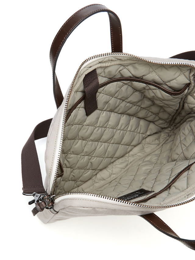 Padded computer bag from Ecoalf made of 100% recycled nylon featuring two brown leather handles, a removable shoulder strap, a top zip fastening and several interior compartments. This bag also features cotton logo tab, leather bottom and inside pocket with velcro closure.