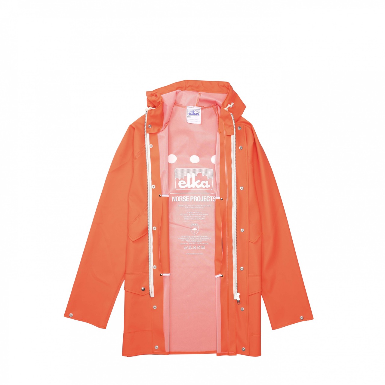 An updated ELKA jacket in collaboration with the Danish rain-wear specialists. Features a snap and zipped front closure, four front military style snap pockets, a drawcord hood, adjustable cuffs and a breathable lining. Classic ELKA regular fit. 90% PVC, 10% polyester. And of course made in Europe.