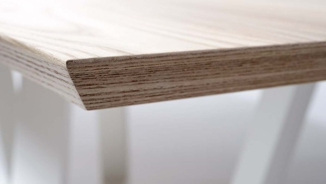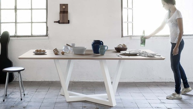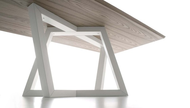 "The essentiality of two identical trapezoidal shapes, intersected, rotated and flipped between them, gives dynamism to the table making new geometrical impression. The wood’s strength used for the plane, is supported by the formal elegance and movement of the legs." Gradosei, Rome, Italy