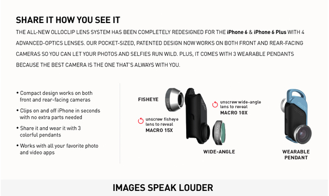 olloclip lens systems are made of precision ground multi-element coated glass optics and work with all photo and video apps. To match your style, the 4-in-1 Photo Lens is available in colors that complement the new iPhone 6 line.