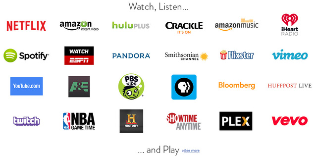 Fire TV Stick delivers instant access to a vast selection of content, including the most popular video and music services such as Netflix, Prime Instant Video, Hulu Plus, WatchESPN, NBA Game Time, Twitch, SHOWTIME ANYTIME, Prime Music, Spotify, Pandora, Vevo, Plex, A&E, PBS, PBS KIDS, WATCH Disney Channel, YouTube.com, and more. The number of video services and games available on Amazon Fire TV has tripled in just seven months, with more services and games being added every week. You can also rent or purchase over 200,000 movies and TV episodes from Amazon Instant Video, which has the world’s largest selection of videos to rent or buy, including new releases and blockbusters.