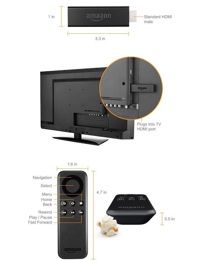 Less than seven months ago, Amazon introduced Amazon Fire TV, and it quickly became the best-selling streaming media box on Amazon. Amazon is now bringing the same experience customers love about Amazon Fire TV—ease of use, great performance, and vast selection—to a smaller and even more affordable device. Introducing Fire TV Stick, a small stick that connects to the HDMI port on your HDTV for instant access to movies, TV shows, music, photos, apps, and games.