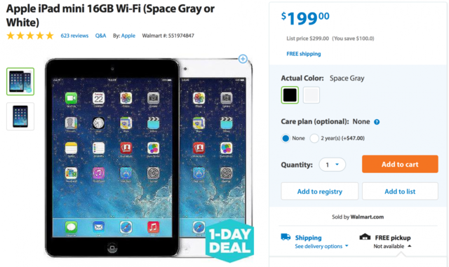 Walmart is offering a 1-day deal on the first generation iPad mini, listing it for $199. That's a $50 discount off the retail price.Walmart has the 16GB Wi-Fi iPad mini in Space Gray or White.Hit the link below for more details...