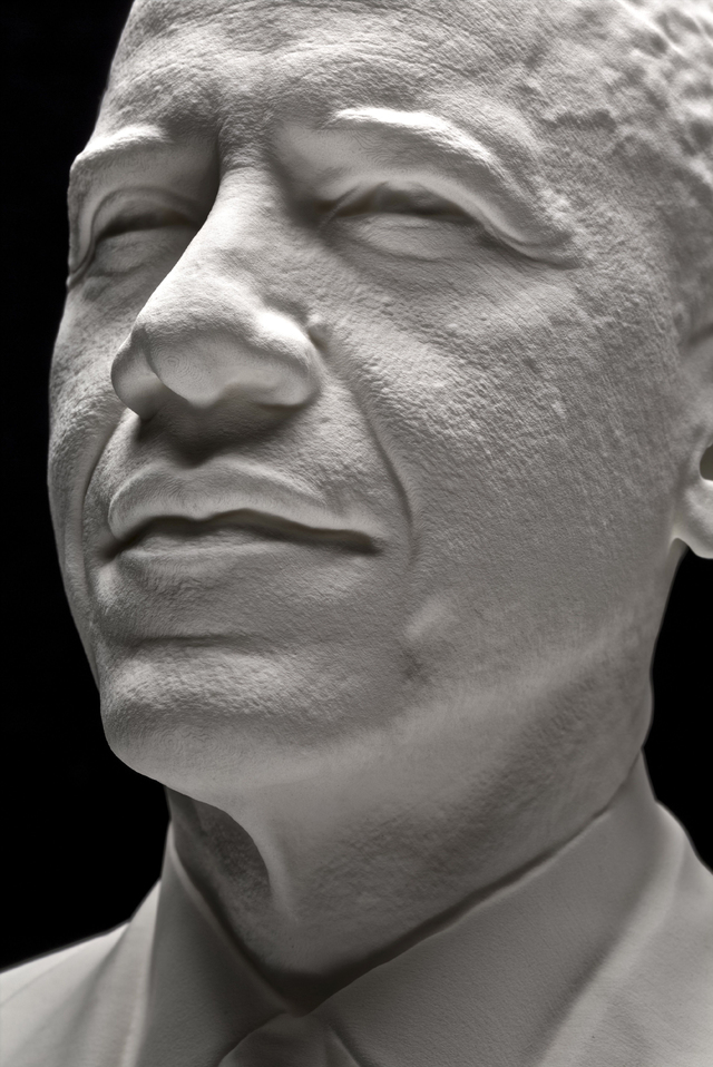 The Smithsonian-led team scanned the President earlier this year using two distinct 3-D documentation processes. Experts from the University of Southern California’s Institute for Creative Technologies used their Light Stage face scanner to document the President’s face from ear to ear in high resolution. Next, a Smithsonian team used handheld 3-D scanners and traditional single-lens reflex cameras to record peripheral 3-D data to create an accurate bust.