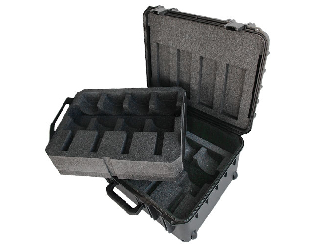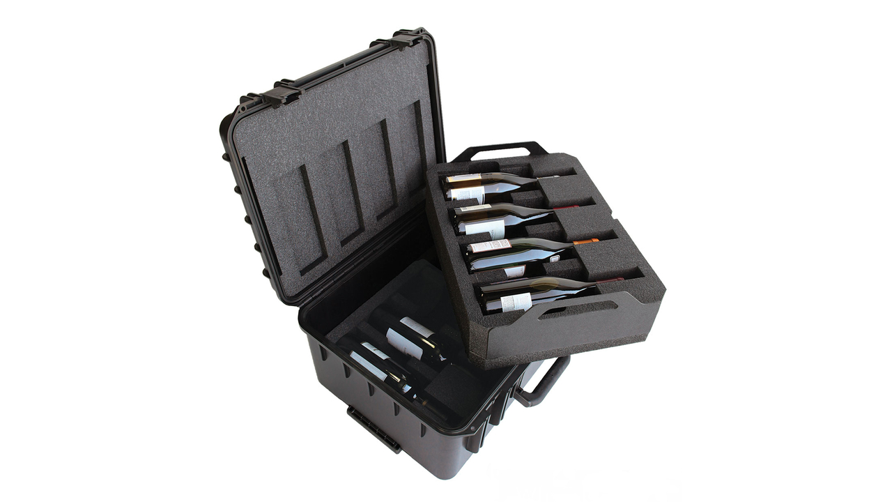 The mobile mini-wine cellar is made of ultra high-strength polypropylene copolymer resin and is fitted with a pull handle and embedded wheels for quick maneuvering. It is water and dust tight, resistant to corrosion and impact damage and includes an automatic pressure release valve. The carrying case also is resistant to UV rays, solvents and fungi. A molded-in hinge, trigger-release latch system makes access and lock down fast and easy. Snap-down rubber over-molded cushion grip handles make lifting comfortable and safe. The exterior dimensions of this premiere airline check-in case are 21.77" L x 17.77" W x 11.49" H.