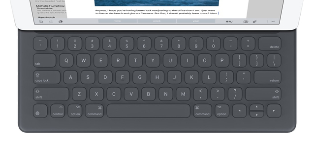 Unlike traditional keyboards, there are no gaps between keys. And it’s coated in a water‑ and stain‑resistant finish, so the Smart Keyboard is resistant to stains and spilling.
