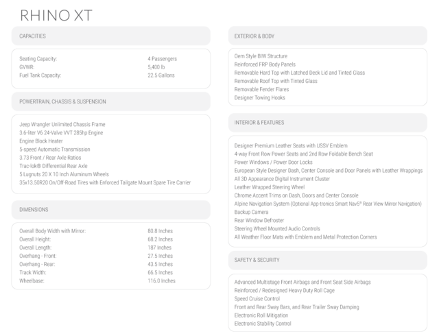 This vehicle uses a mechanically stock Jeep Wrangler Unlimited platform and drivetrain, for its newly designed interior and exterior. USSV’s team of talented designers and engineers developed this stylish, rugged and seductive vehicle with safety in mind. It’s everything one needs in an All-Terrain SUV with the latest technology. Suspension options are also available.