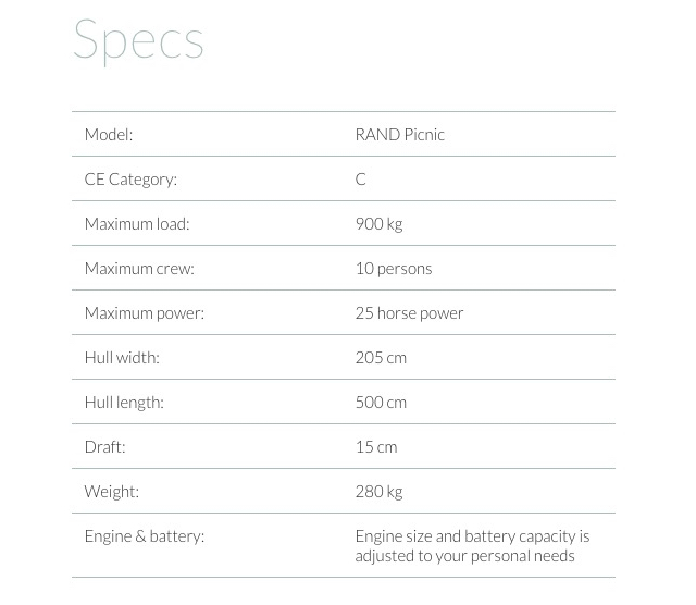 The Picnic boat is produced to offer the most simple and relaxed sailing experience with maximum usability onboard. The low maintenance Picnic motorboat has easy steering control with the ultra simple, hand operated tiller and it requires no sailing license or experience to operate the boat.