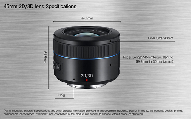 The Samsung 45mm 2D/3D lens (sold separately) opens up an exciting world of 3D imaging possibilities and is the world's first one-lens 3D system for a consumer camera. Capable of capturing both still pictures and full 1080p HD video, the Samsung NX300 and 45mm 2D/3D lens kit have become the only compact system camera supporting both 3D still and 3D movie.