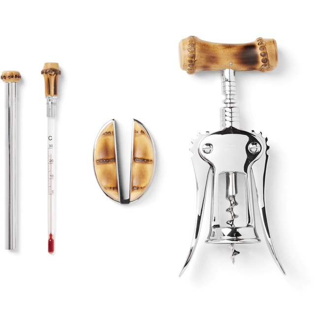 champagne opener and stopper, jigger, lemon knife and fork, bar knife and ice tongs
