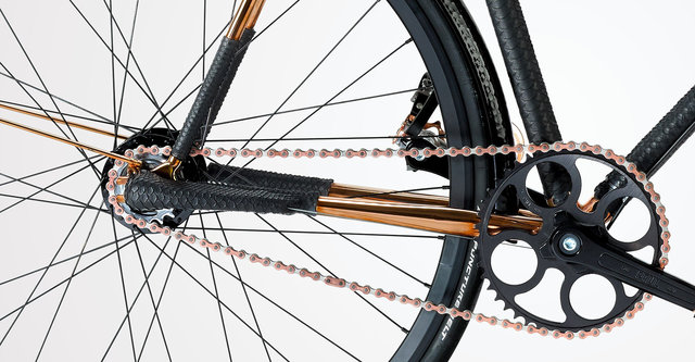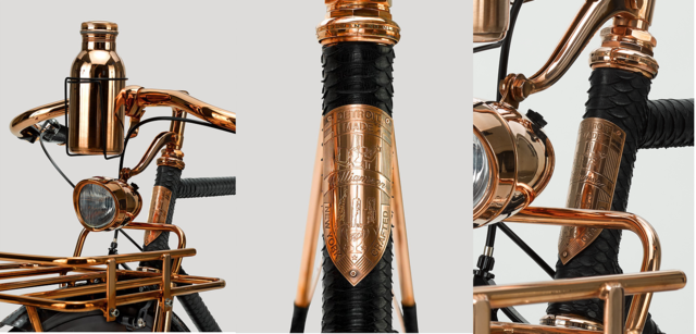 Williamson bicycles are hand brazed in Detroit using highest quality chromoly tubing. The frame, fork, lugs, and stem are all handmade by Williamson, with individual copper details and subtle logos brazed in place. Each component is wrapped with python or crocodile and hand sewn. Brake levers, gear system, pedals, and cranks are then assembled to your exact specifications.