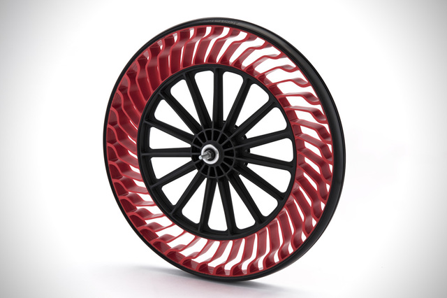 The “Air Free Concept” is a technology that eliminates the need for tires to be inflated with air to support the weight, using a unique structure of spokes stretching along the inner sides of tires. In addition, the resins that are used in the spokes and rubbers help realize more efficient use of resources.