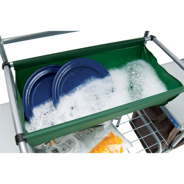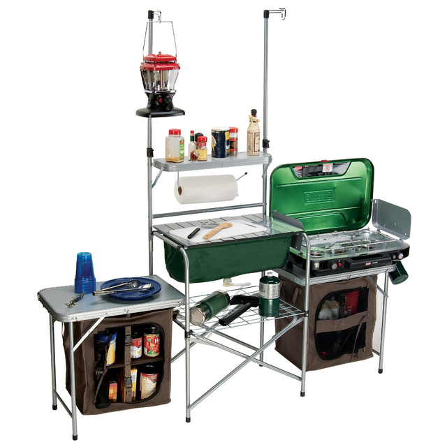 The Gander Mountain Deluxe Camp Kitchen features a large center table and 2 side stands for stove or other preparations. The center tabletop effortlessly removes to expose a PVC sink with drain. Weather-resistant, removable, hanging pantries with zippered front openings and carry handles are ideal for storing food, plates and camping kits. Dual, overhead lantern hangers and a folding spice shelf with S-hooks complete this kitchen. Made of lightweight, strong, tubular steel alloy frame with powder coating. Folds away for easy storage. Includes Cordura nylon carry bag. Dimensions: 69"L x 17.5"W x 71"H.