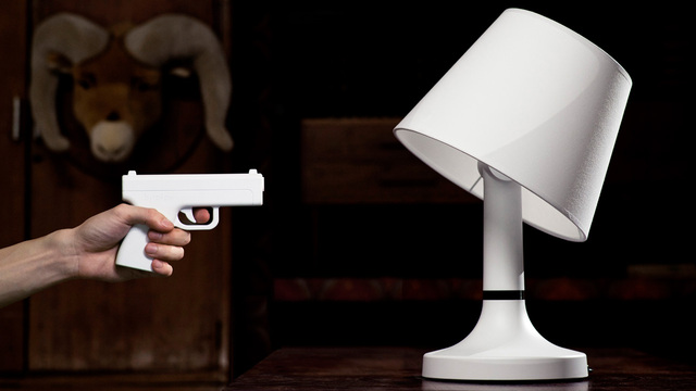 The BANG! Remote Lamp is exactly as much fun as it sounds. To turn it off, aim the remote in the direction of the lamp—as the light goes out, the lampshade knocks to the side. To power it back up, pull back on the remote again, and watch as the shade slowly rises up and turns on the light at the same time.