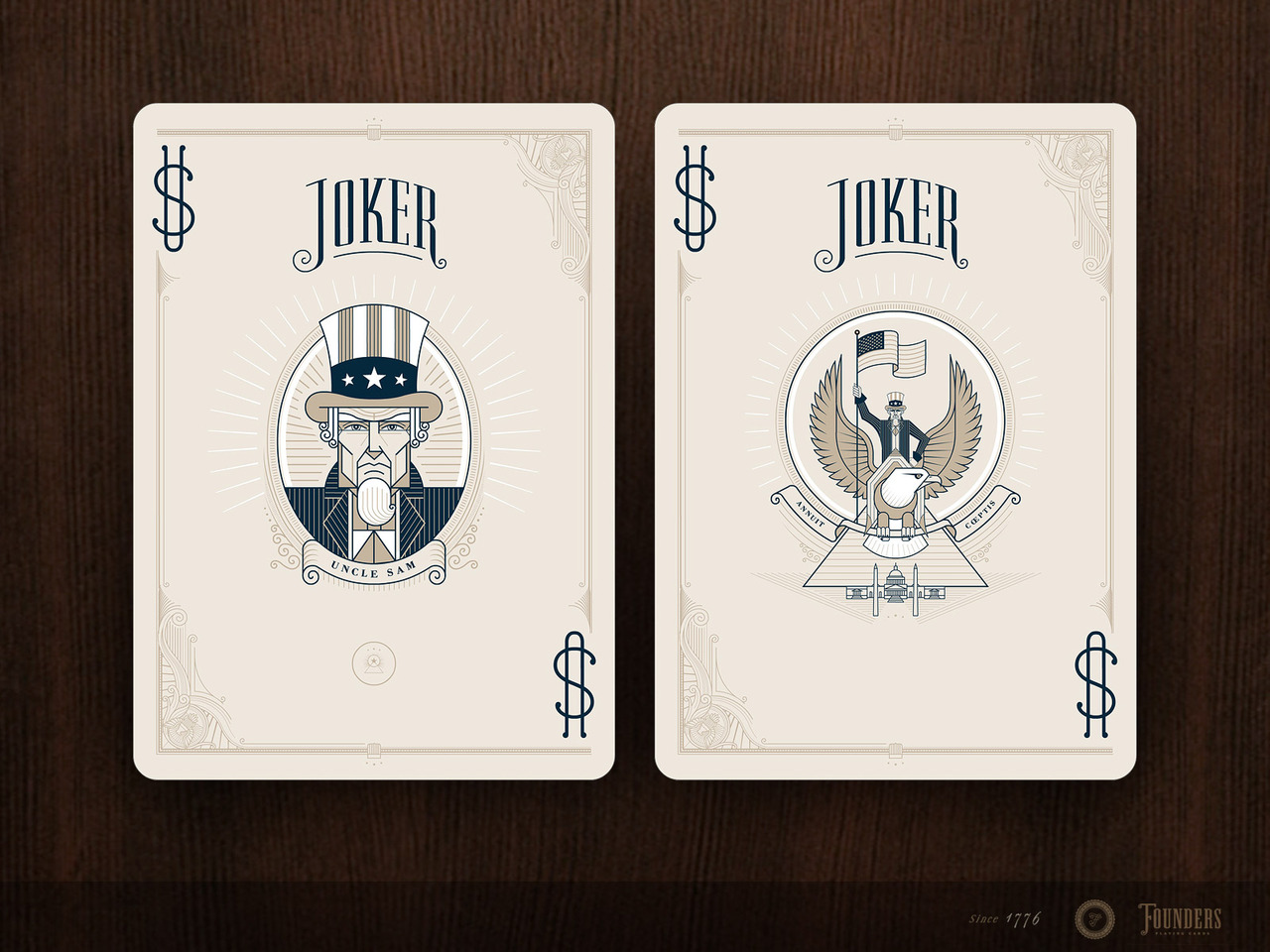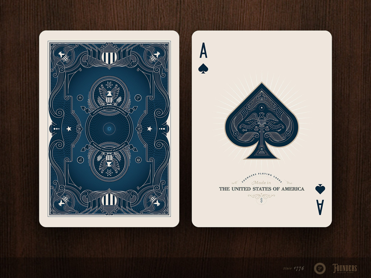 Before the founding of America, the classical world used each suit to represent a different social class. The Founders deck is structured on a model using these classical archetypes of Nobility (Spades), Clergy (Hearts), The People (Clubs), and Merchants (Diamonds). Each Founder is seen brandishing their own unique element, representative of their role as a founder and the legacy they have left behind as our inheritance.