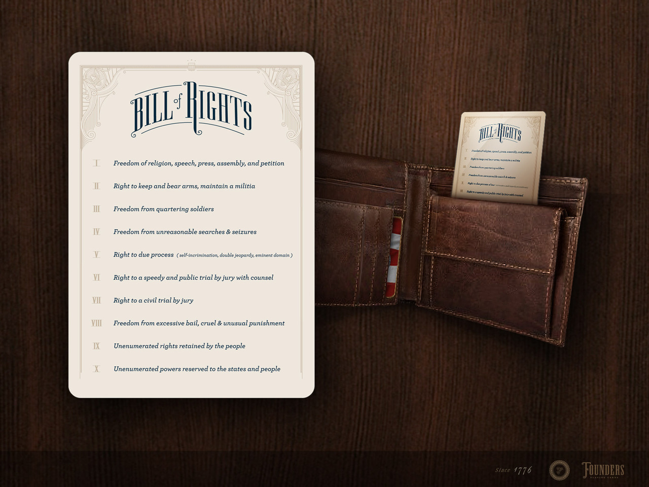 The Bill of Rights card can be kept with the deck or carried around as a pocket reference of the first ten amendments to U.S. Constitution.