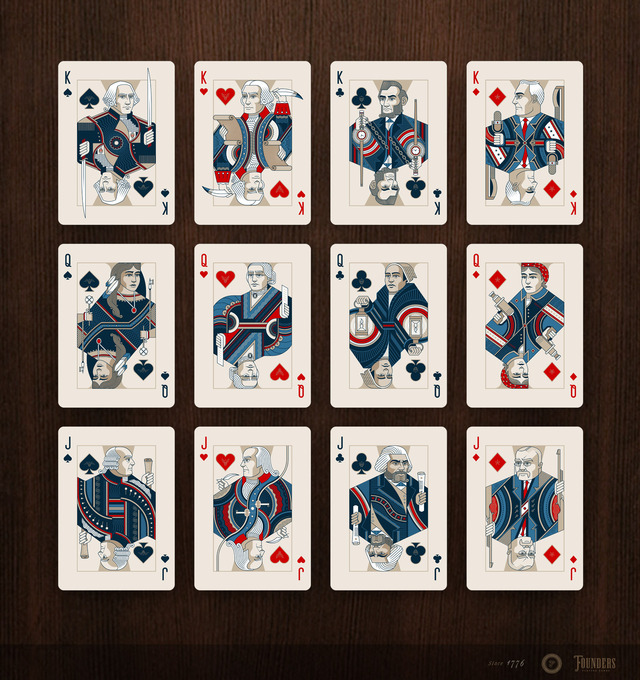 Founders Playing Cards are an independently created and crafted American deck, honoring twelve of the most inspiring & influential founders of modern day United States, designed in a neoclassical style reminiscent of architectural, monumental & engraving work from the documents & currency of our nation’s history.