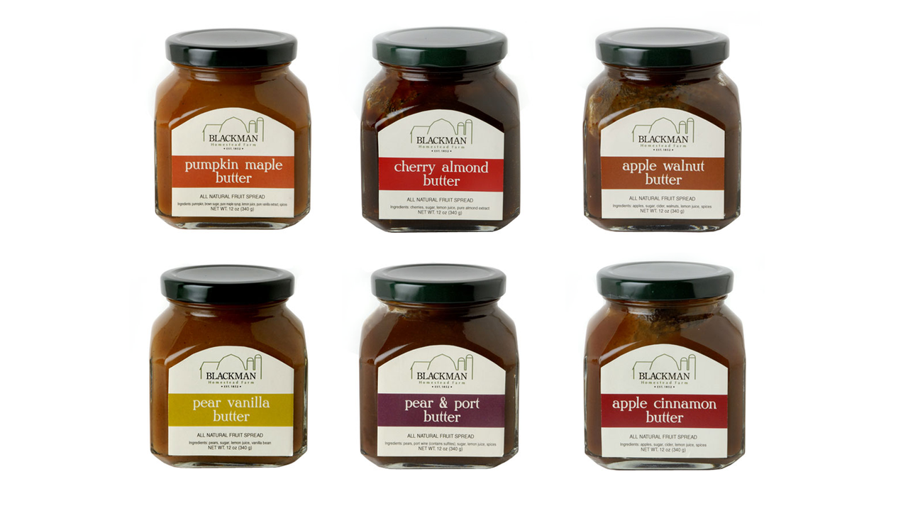 Nestled on the picturesque Niagara Escarpment in Western New York, the Blackman Homestead Farm produces delicious all-natural fruit butters made by blending home and locally grown fruit with unique high quality ingredients. These versatile combinations are great on toast, paired with cheeses, as sides with meat, or as dessert toppings.