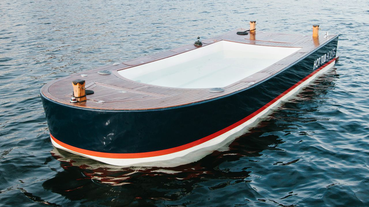 An integrated diesel-powered boiler with an adjustable thermostat heats the tub's water to a maximum 104° F. A waterproof stereo system plays music from your MP3 player through two flush-mounted 50-watt speakers that pop-up from the deck. Four ice chests built into the deck provide ample storage for your preferred libation with additional storage compartments fore and aft. A teak swimstep provides easy entry into and from the surrounding water. A 24-volt electric motor propels the boat up to 5 mph on calm water, steered via a joystick by a bather located starboard/aft. Its rechargeable battery bank provides up to 10 hours of power from an overnight charge using its built-in Smart Plug shore power connection and on-board chargers.