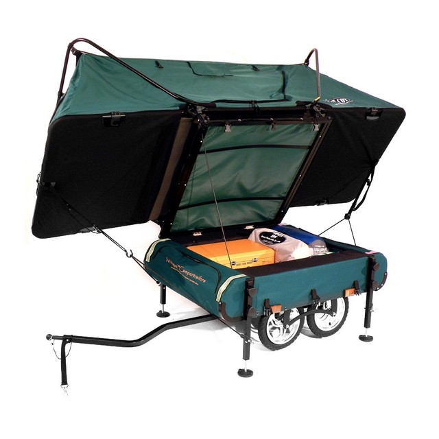 Innovative and unique, the Midget Bushtrekka trailer from Kamp-Rite is perfect for the bike or camping enthusiast. The one-of-a-kind pivoting wheelset and alloy wheels make for a comfortable ride over most terrain; safety reflectors and safety tape offers nighttime visibility. And when you're finished trekking for the day, open up the included Oversized Tent Cot for a great night's rest!
