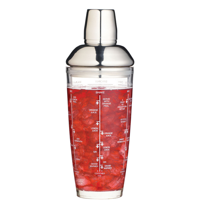 If Cocktail Hour arrives and you're stuck for inspiration what do you do? You could resort to an old favourite, maybe consult a Cocktail book or you could reach for this Boston Glass Cocktail Shaker.The Bar Craft cocktail shaker with a stainless steel lid and glass base features handy cocktail recipe markings on the outside, ideal for making your favourite cocktails. Recipes include Martini Dry, Rob Roy, Red Lion, Manhattan, Bronx, and Vodka Dry.